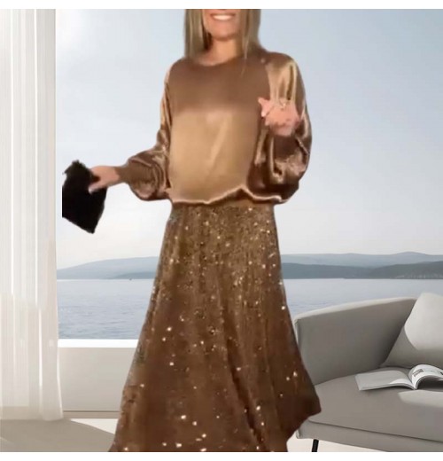 2025 Neue AnkunftZweiteiliges Set aus langrmeligem Top und Pailletten-Maxirock für Damen
