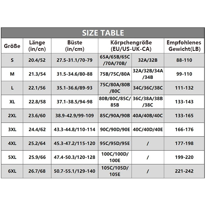Gren: S / M / L / XL / 2XL / 3XL / 4XL / 5XL / 6XL